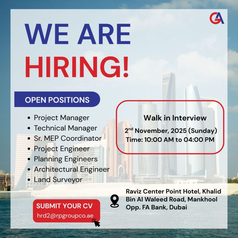 Gulf Asia Contracting Co. is part of the RP Group of Companies and has established itself as a trusted name in the UAEβs construction sector. The company is known for delivering landmark projects with high standards of quality and safety. This walk-in interview initiative reflects GACβs commitment to attracting top talent for its ongoing and upcoming developments.