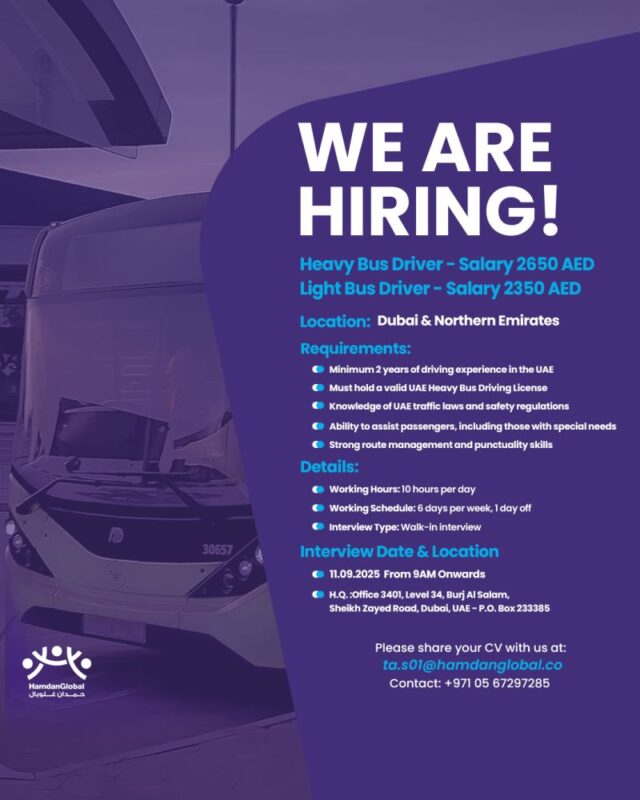 Hamdan Global Walk in Interview in Dubai represents a valuable opportunity for qualified UAE-based bus drivers to join Hamdan Global and advance their careers within a well-established organization. In addition to attending the walk-in interview, applicants can also share their CVs in advance to [email protected]. For any inquiries, applicants may contact the recruitment team directly at +971 05 67297285.