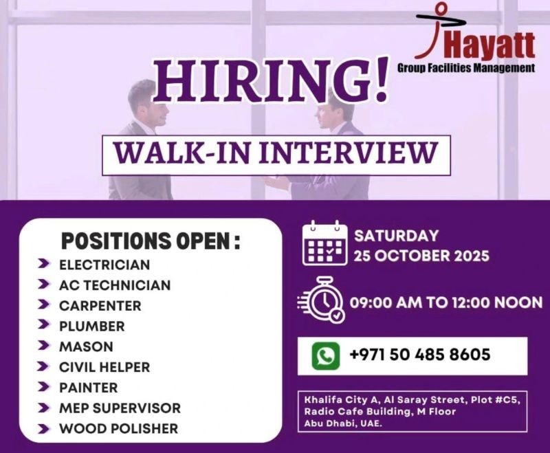 Hayatt Group Walk in Interview in Abu Dhabi is an excellent opportunity for skilled technicians and helpers seeking a stable and rewarding position in a well-reputed facilities management company. With the prospect of immediate joining for selected candidates, the event is expected to attract a large number of qualified professionals aiming to work in a dynamic environment.