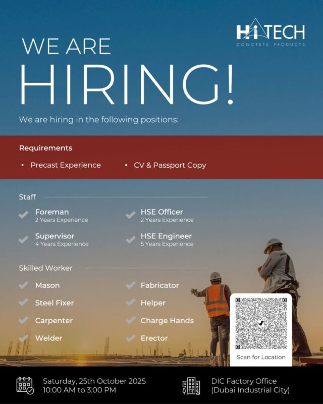 Hitech Concrete Products is hosting Hitech Open Day Recruitment in Dubai, aimed at attracting skilled workers for various roles in the construction and manufacturing sectors. This event will provide an excellent opportunity for job seekers to explore career prospects with a leading concrete products company π’.