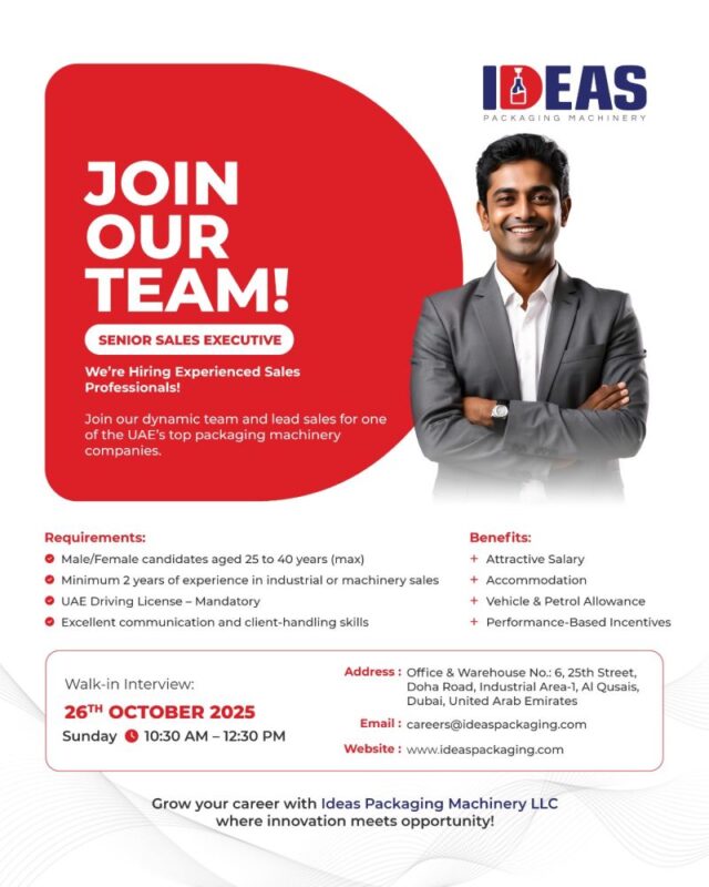 If you are an experienced sales professional seeking a rewarding opportunity in the industrial and packaging machinery sector, Ideas Packaging Machinery invites you to its Ideas Packaging Machinery Walk in Interview in Dubai. Known as one of the leading packaging machinery companies in the UAE, Ideas Packaging Machinery is opening its doors to dynamic and result-driven individuals ready to make their mark in a competitive market π’.