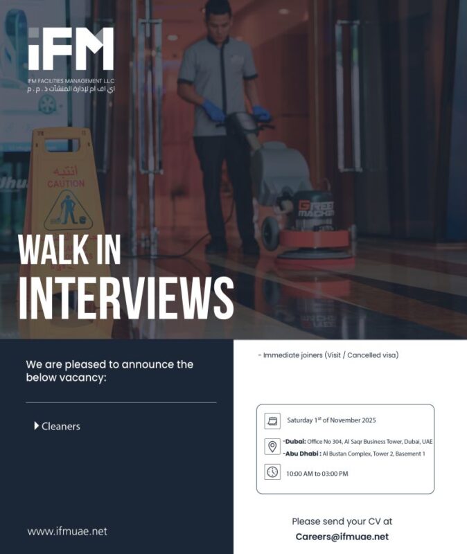 Interested candidates can attend the iFM Walk in Interview in Dubai & Abu Dhabi at the specified location and dates. Attend on the specified date with your updated CV and seize your chance to join a dynamic team. This is your opportunity to advance your career with a leading company in a professional and growth-oriented environment. Kindly send your CV at [email protected].
