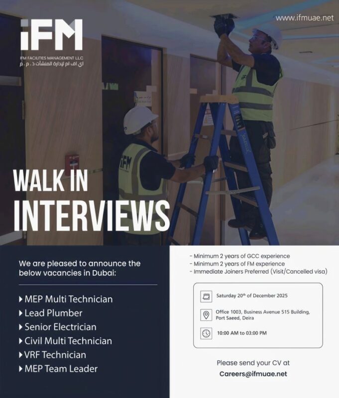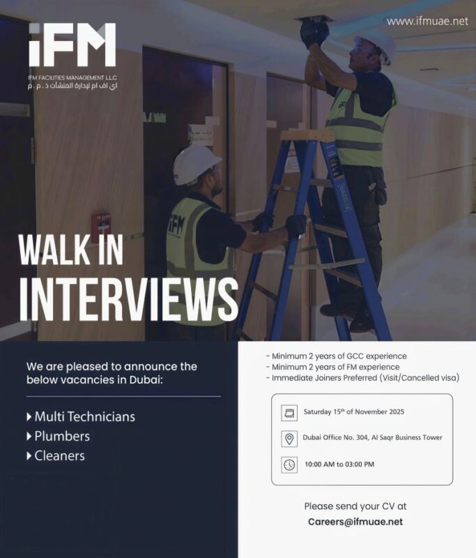 A renowned facilities management company in Dubai, is holding iFM Walk in Interview to fill multiple vacancies across various skilled trades and supervisory roles. This is an excellent opportunity for experienced professionals in the facility management sector to join a reputable company π’.