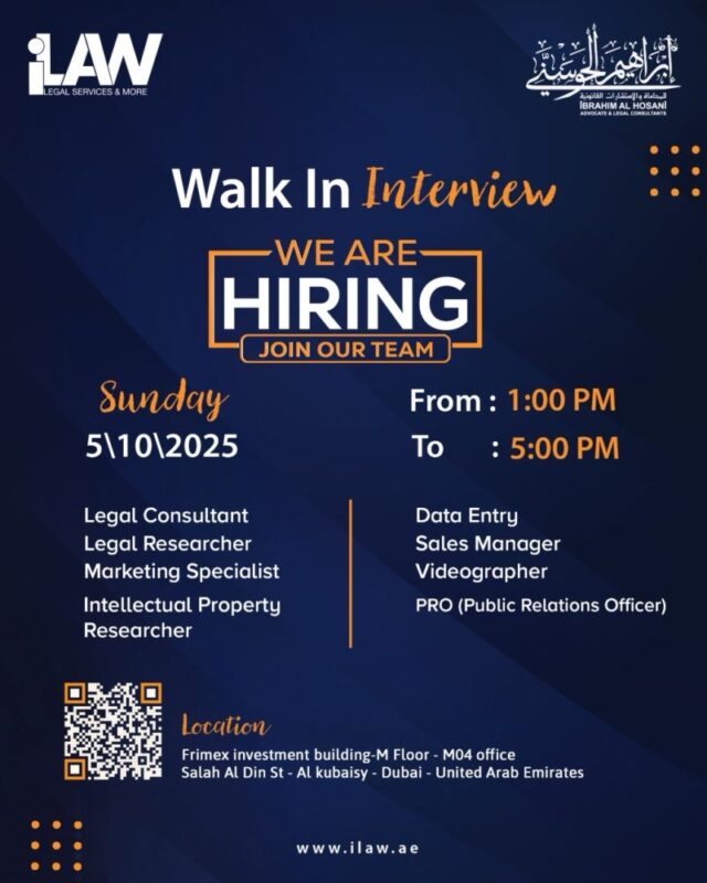 Ibrahim Al Hosani Advocates & Legal Consultants, also known as iLAW, is opening its doors for a iLAW Walk in Interview in Dubai on Sunday, 5th October 2025. The firm is inviting talented professionals from various fields to join its expanding team and be part of one of the UAE’s well-established names in the legal and consultancy sector 📢.