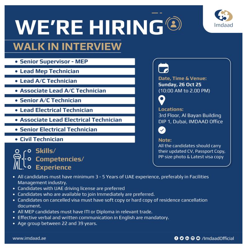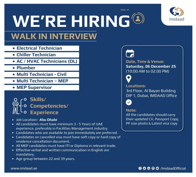 Imdaad offers a dynamic and professional work environment with opportunities for growth in the facilities management sector. If you are a qualified technician or supervisor looking to take the next step in your career, this walk-in interview is your chance to become part of a trusted brand in the UAE.