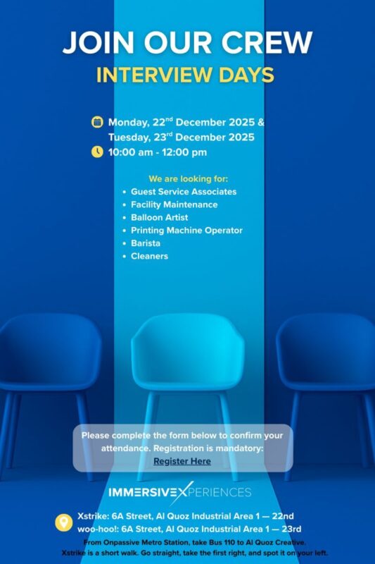 Immersive Experiences Walk in Interviews presents a valuable opportunity for job seekers in Dubai who are looking to build or advance their careers in hospitality, entertainment, and experiential services. With mandatory registration and limited interview hours, interested candidates are encouraged to prepare in advance and attend promptly. Click Here to Register.