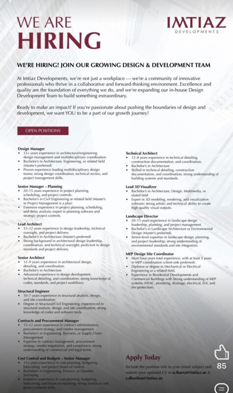 A prominent name in Dubai’s real estate and property development sector, has announced Imtiaz Developments Recruitment in Dubai to strengthen its in-house Design Development Team. Known for delivering high-quality residential and commercial projects, the company continues to invest in top-tier talent to support its growing portfolio and future vision 📢.