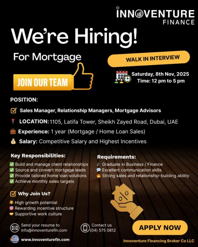 Dubai’s financial sector continues to expand, opening doors for ambitious professionals looking to build a rewarding career. Innoventure Financing Broker, one of the region’s rapidly growing mortgage and finance specialists, is organizing Innoventure Financing Broker Walk in Interview in Dubai for dynamic individuals seeking roles in the mortgage and home loan industry. This event presents an excellent opportunity to join a company known for its progressive work environment, competitive benefits, and exceptional career growth prospects 📢.