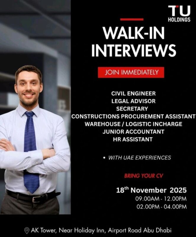 Job seekers looking for a fresh start or new opportunity in Abu Dhabi should not miss this TU Holdings Walk in Interview. With multiple positions available and a chance to join immediately, this is a golden opportunity to step into a promising role with a reputed organization.