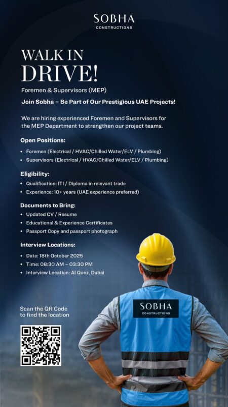 Opportunities like the Sobha Construction Walk in Interview in Dubai don’t come around every day. They’re the kind of chances that can open doors to long-term careers, exciting projects, and professional growth in one of the most competitive markets in the world. If you’ve been waiting for the right moment to make your move in the UAE construction industry, this is it.