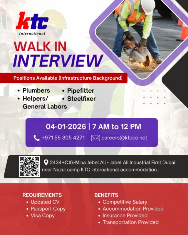 KTC International Walk in Interviews in Dubai initiative reflects KTC International’s commitment to sourcing top talent and building a strong workforce. Candidates ready to showcase their skills, embrace new challenges, and contribute to large-scale projects are encouraged to attend.