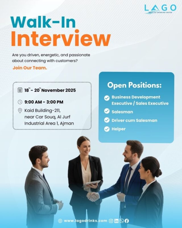 One of the leading bottled water companies in the UAE, has announced Lago Water Walk in Interview in Ajman for various job positions. This recruitment opportunity is open from 9th to 15th October 2025, offering a chance for both freshers and experienced candidates to join their dynamic team π’.