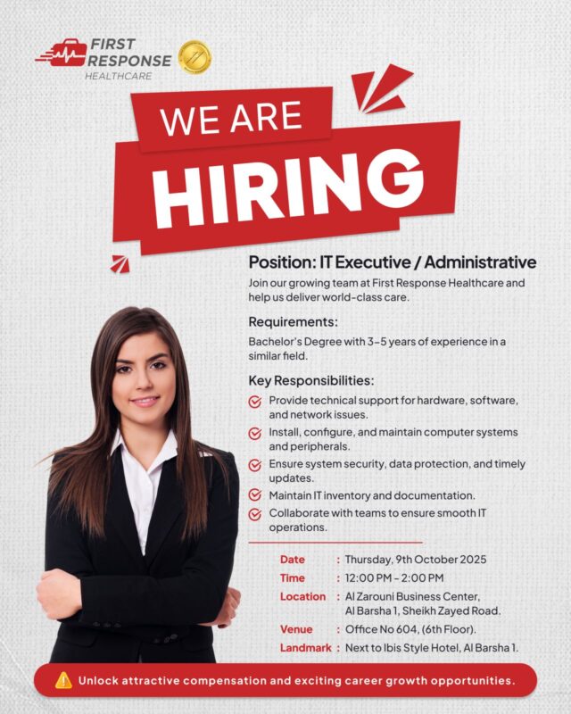 First Response Healthcare is actively seeking a highly experienced IT Executive / Administrative to join their growing team in Dubai.