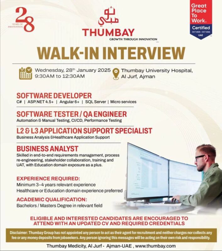 One of the UAE’s most innovative and fast-growing healthcare and education conglomerates, has announced Thumbay Group Walk in Interviews in Ajman. This opportunity is aimed at technology professionals who are eager to contribute to the organization’s digital transformation initiatives 📢.