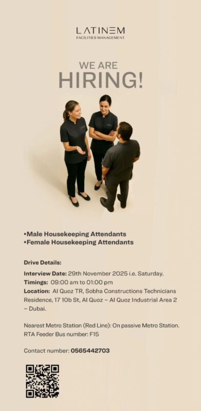 If you meet the experience requirements and are looking to build your career with one of the UAE’s leading facilities management companies, attend the Latinem FM Walk in Interview in Dubai with your updated CV on 29th November 2025 (Saturday) between 9:00 AM and 1:00 PM. Latinem Facilities Management is part of the prestigious Sobha Group, known for its high standards in property development and maintenance.
