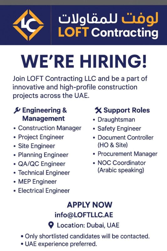 LOFT Contracting Recruitment in Dubai presents an excellent opportunity for experienced professionals seeking to advance their careers with a forward-thinking construction firm committed to excellence in every detail. Interested candidates are invited to submit their resumes to [email protected]. The recruitment process is designed to identify dedicated professionals who share LOFTβs passion for delivering exceptional results. Only shortlisted candidates will be contacted for further steps.