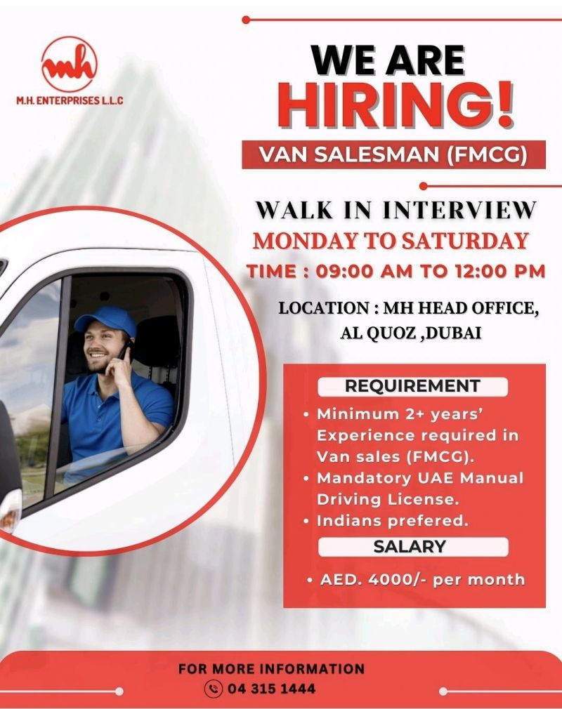 Join M H Enterprises for a stable career as a Van Salesman (FMCG) in Dubai. Enjoy competitive salaries, visa, medical insurance, accommodation, and trip allowance. Benefit from a supportive work environment, job security, and opportunities to grow in a reputable transport company across the UAE.
