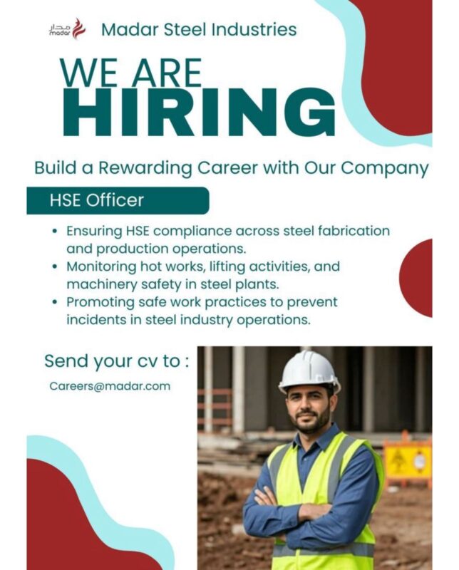 As part of its recruitment in Dubai, Madar Steel Industries is hiring an HSE Officer to strengthen its safety management framework across steel fabrication and production operations. This role is ideal for professionals who have hands-on experience in industrial safety and a strong understanding of HSE regulations within the steel industry.
