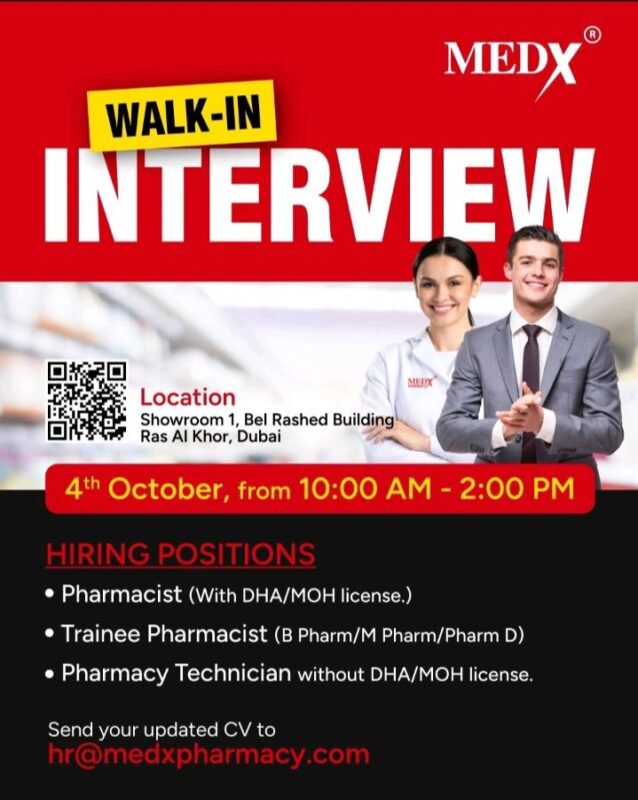 MedX Pharmacy Walk in Interview in Dubai is ideal for individuals with a solid background in pharmaceuticals who are eager to work in a fast-paced and supportive environment. Interested candidates are advised to bring their updated CVs to the interview and dress professionally. For those who wish to submit their CVs in advance, applications can be emailed to [email protected].