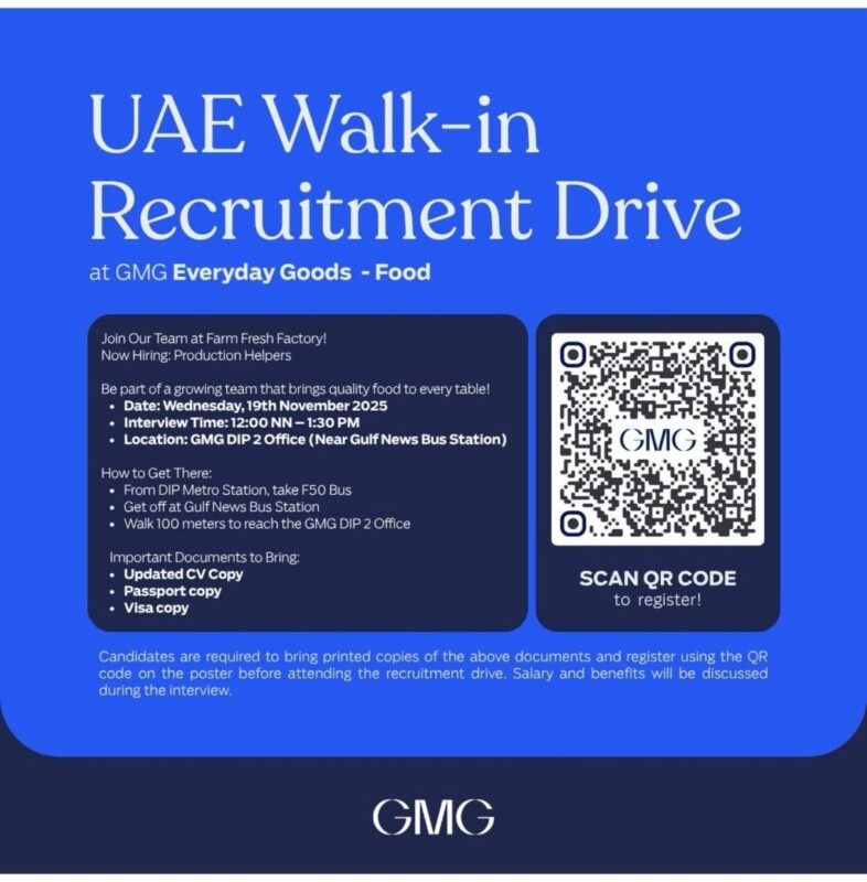 While GMG Walk in Interview in Dubai are being conducted, candidates are also encouraged to register their interest in advance via GMG’s official careers portal. Interested individuals can apply directly using the following link: Apply Here – GMG Production Helper Position.