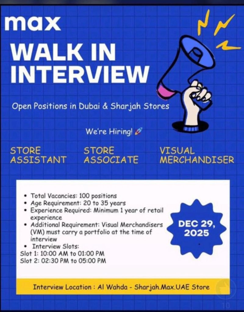 MAX, one of the leading fashion retail brands in the Middle East, has announced a large-scale Max Fashion Walk in Interview in Sharjah to recruit talent for its Dubai and Sharjah stores. The hiring drive reflects the brandβs continued expansion across the UAE and its commitment to strengthening in-store operations with skilled retail professionals π’.