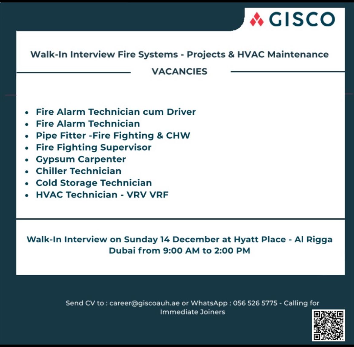 To apply for these positions, candidates are requested to bring their updated CV to the GISCO Walk in Interview in Dubai. Additionally, applicants can send their CVs to [email protected] or contact via WhatsApp at 056 526 5775. It is important to mention the specific position being applied for in the subject line of the email or message.