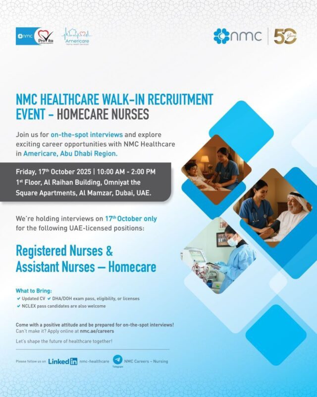 NMC Healthcare Walk in Interview in Dubai is a golden chance for nursing professionals to join one of the UAEβs most reputable healthcare providers. Simply bring your updated CV and DHA/DOH license for an on-the-spot interview. Can’t attend? Apply online.