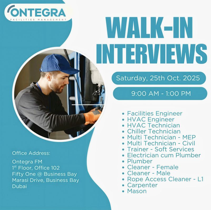 Ontegra Walk in Interview in Dubai is particularly beneficial for those with relevant experience in facilities management, as it provides a platform to directly interact with potential employers and learn more about the opportunities available. Bring your CV and relevant certificates for an on-the-spot interview.