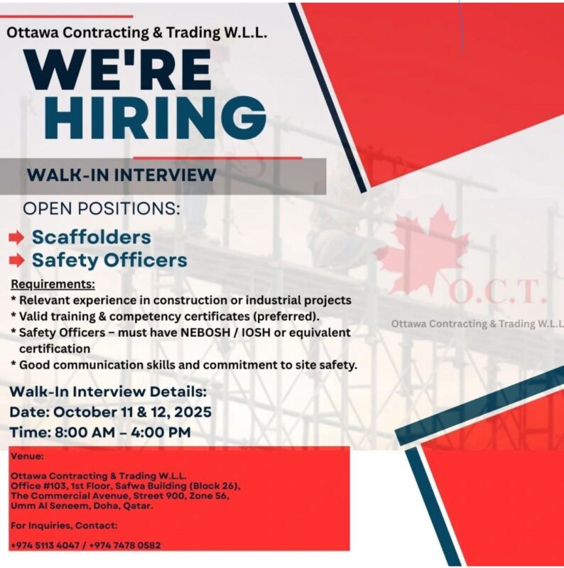 The upcoming Ottawa Contracting Walk in Interview is an excellent opportunity for skilled Scaffolders and Safety Officers seeking career advancement in Qatarโs thriving construction sector. Candidates meeting the requirements are encouraged to attend the interview with updated CVs, certificates, and supporting documents.