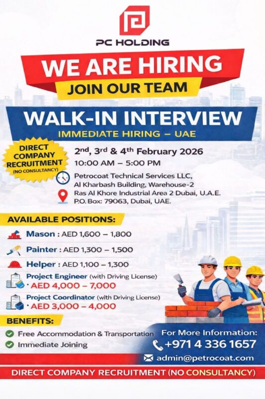 The PC Holdings Walk in Interview in Dubai presents a valuable opportunity for skilled workers and professionals seeking stable employment in the UAE. With competitive salaries, essential benefits, and direct recruitment, this hiring drive is expected to attract a large number of candidates. Interested individuals are advised to attend early and prepare all required documents to maximize their chances of selection.