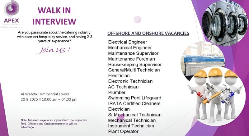 Candidates are encouraged to attend APEX Facility Walk in Interview in Abu Dhabi on Saturday, 20th September 2025, with their updated CVs and relevant documents. This is a fantastic opportunity for those looking to advance their careers in the facility management sector.