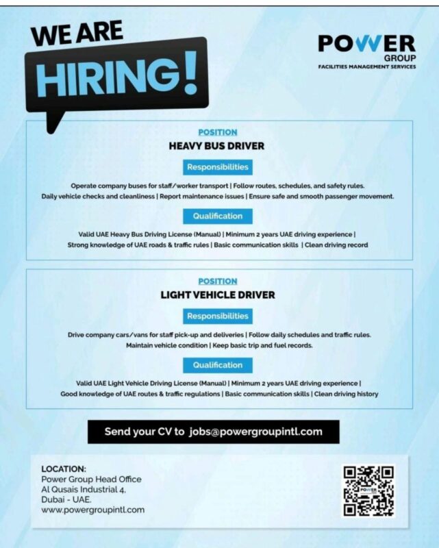 A well-established name in facilities management services in the UAE, has announced Power Group Recruitment in Dubai initiative aimed at strengthening its transport operations. This hiring move reflects Power Groupโs commitment to ensuring safe, reliable, and efficient transportation services for its growing workforce and clients ๐ข.