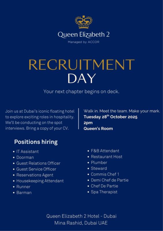 Queen Elizabeth 2 Open Day Recruitment in Dubai offers candidates the chance to meet recruiters face-to-face, showcase their skills, and learn more about working with one of the most distinguished hotels under Accor’s management. Applicants are encouraged to bring a copy of their CV and attend in person for on-the-spot interviews with the hiring team.