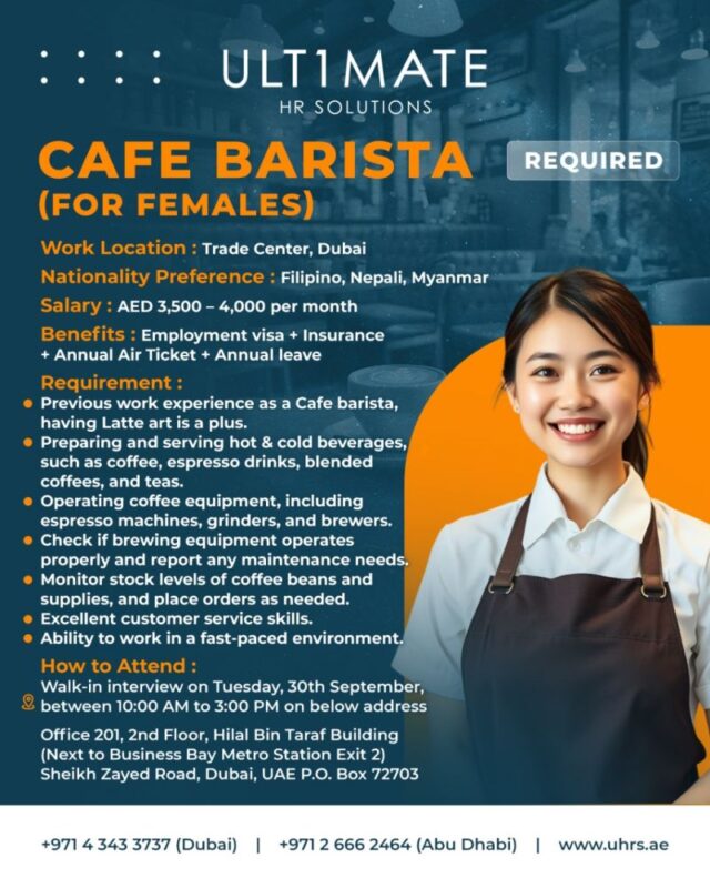 Don’t miss this opportunity to take your career to the next level with Ultimate HR Solutions Walk in Interview in Dubai. Bring your enthusiasm and expertise to team and embark on a rewarding journey in the recruitment industry. For inquiries or directions, please call at given numbers. The team will be happy to assist you.
