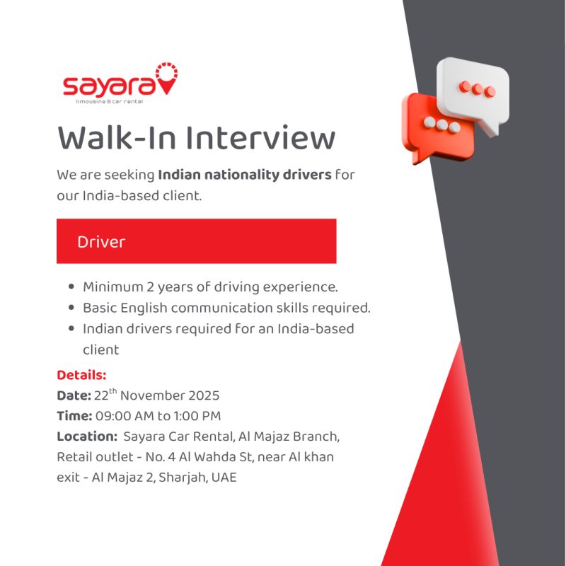 Sayara Walk in Interview in Sharjah presents a unique opportunity for experienced candidates to join a prestigious company in the transportation sector. Donβt miss this opportunity to step into a promising career with Sayara Car Rental and Limousine.