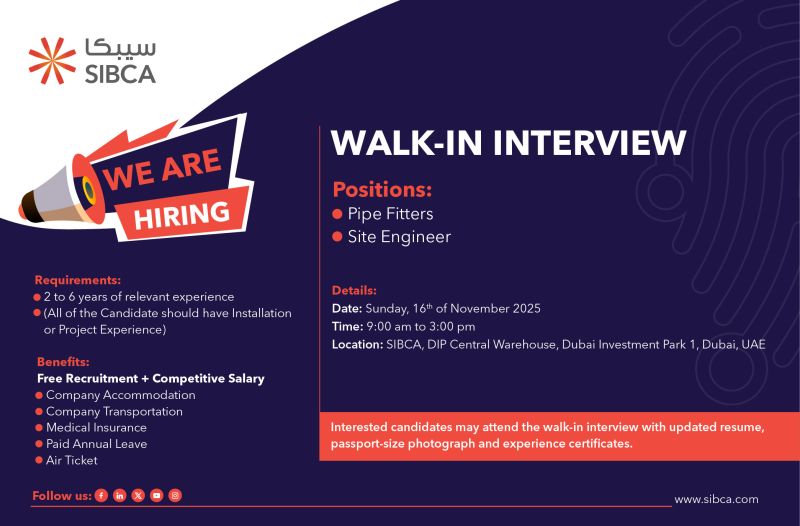 SIBCA Walk in Interviews in Dubai presents a remarkable opportunity for professionals to become part of a company that continues to set benchmarks in the UAE’s technical and engineering landscape. Eligible candidates can walk in directly on the mentioned date and time at SIBCA HQ. For more information about the company and its ongoing projects, candidates can visit the official website.