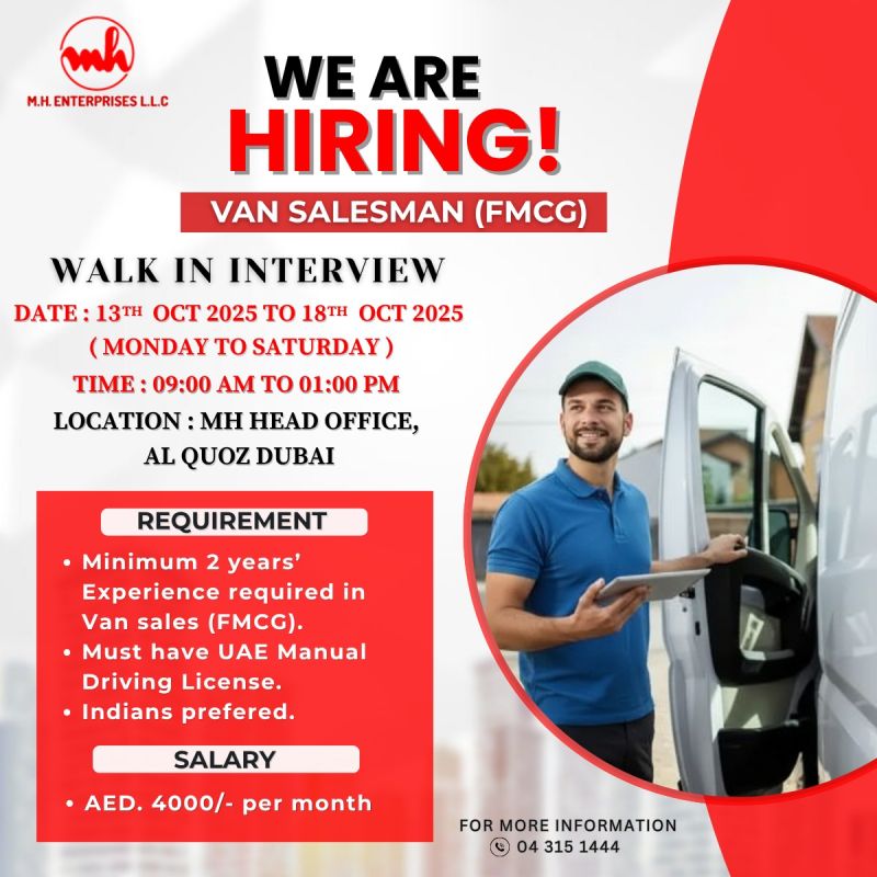 Join M H Enterprises for a stable career as a Van Salesman (FMCG) in Dubai. Enjoy competitive salaries, visa, medical insurance, accommodation, and trip allowance. Benefit from a supportive work environment, job security, and opportunities to grow in a reputable transport company across the UAE.