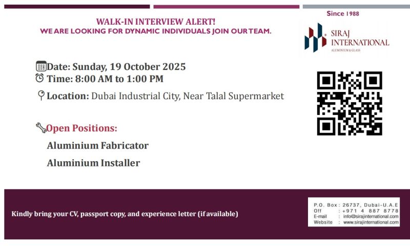 Siraj International Walk in Interview in Dubai presents a valuable opportunity for experienced aluminium professionals to become part of a reputable organization known for quality, innovation, and excellence in the UAE’s construction industry. More details about the company and its services are available on the official website.