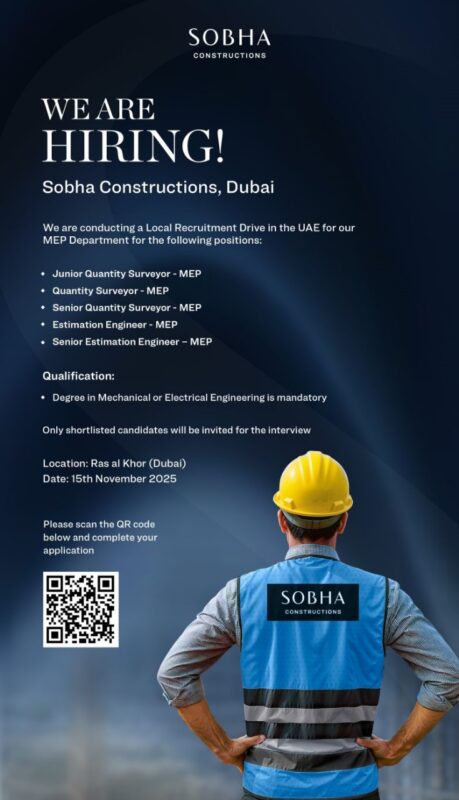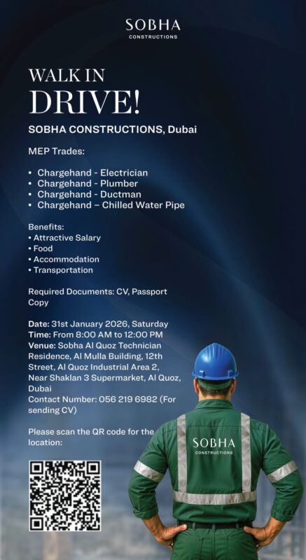 Sobha Construction Walk in Interview in Dubai is committed to employing dedicated professionals with proven experience in high-rise building projects. Attendees are encouraged to arrive early, as interviews will be conducted on a first-come, first-served basis. Don’t miss this chance to be part of a leading construction firm.