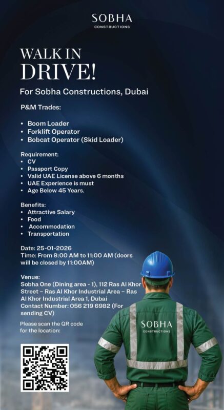 Sobha Construction Walk in Interview in Dubai is committed to employing dedicated professionals with proven experience in high-rise building projects. Attendees are encouraged to arrive early, as interviews will be conducted on a first-come, first-served basis. Don’t miss this chance to be part of a leading construction firm.