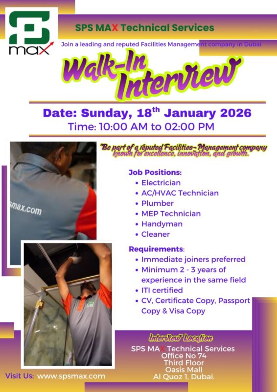 A well-established and reputed Facilities Management company in Dubai, has announced SPS MAX Technical Services Walk in Interview to recruit skilled technical and support professionals. Known for its commitment to service excellence, innovation, and continuous growth, SPS MAX continues to strengthen its workforce to meet the rising demands of the facilities management sector in the UAE π’.