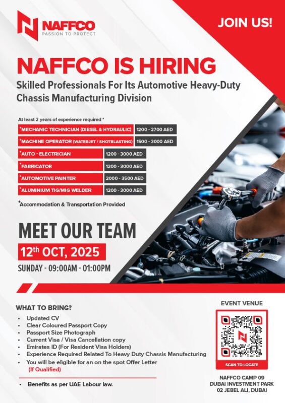 Qualified candidates who meet the requirements are encouraged to attend the NAFFCO Walk in Interview in Dubai on Sunday, 12th October 2025. This is a great chance to join a prestigious company and contribute to important safety initiatives. For further details, prospective candidates can visit the interview location directly.