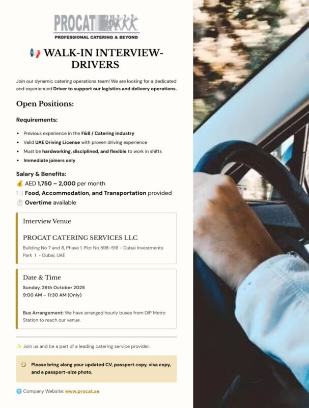For candidates unable to attend the Procat Catering Services Walk in Interview in Dubai in person, Procat Catering Services has provided an alternative. Applicants may forward their CVs directly to [email protected] for future consideration. This ensures that talented professionals still have the opportunity to join the team, even if they cannot attend the scheduled session.