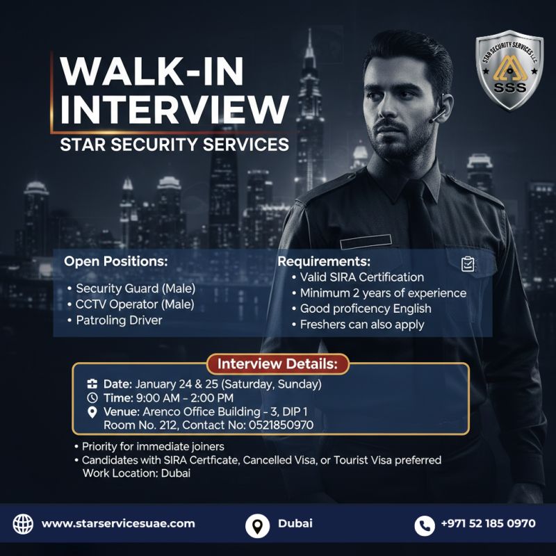 Star Security Services Walk in Interview in Dubai presents an excellent opportunity for qualified security professionals to join a reputed company. Interested candidates should attend the interview within the specified dates with the necessary documents.
