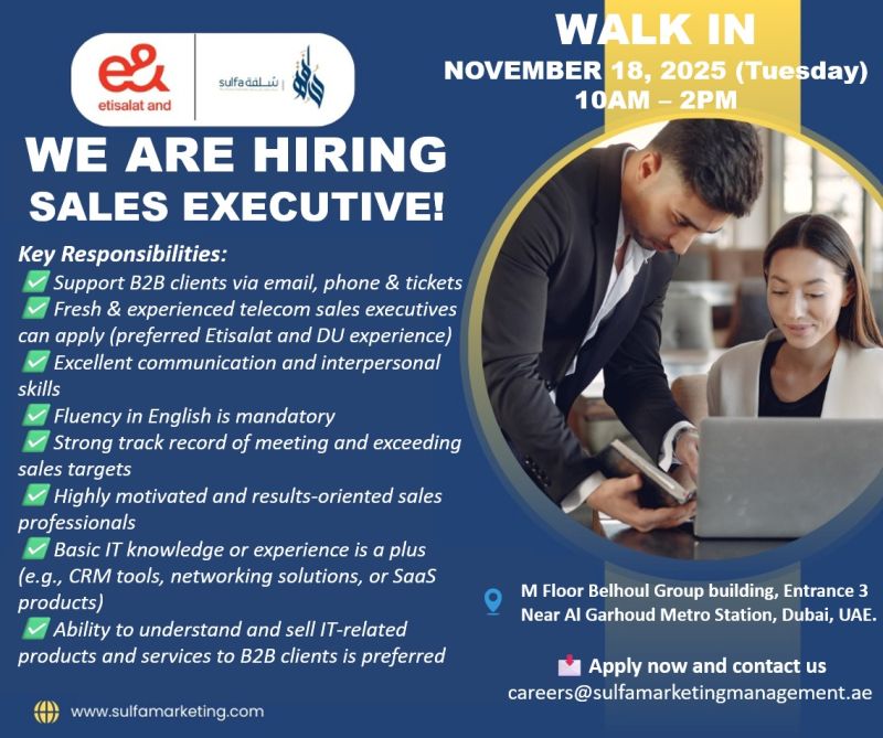 Sulfa Marketing, a growing name in the UAE’s telecom and IT solutions sector, has opened applications, inviting both fresh and experienced professionals to attend its upcoming Sulfa Group Walk in Interview in Dubai. The hiring initiative aims to expand the company’s business-to-business (B2B) sales team, supporting its continued growth in the competitive telecommunications market 📢.