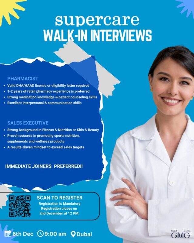 A renowned name in the UAE healthcare retail sector, is conducting Supercare Pharmacy Walk in Interview in Dubai for dynamic professionals looking to advance their careers in the pharmacy and wellness industry. The interview is scheduled for 6th December, and interested candidates are urged to register before 2nd December at 12 PM π’.