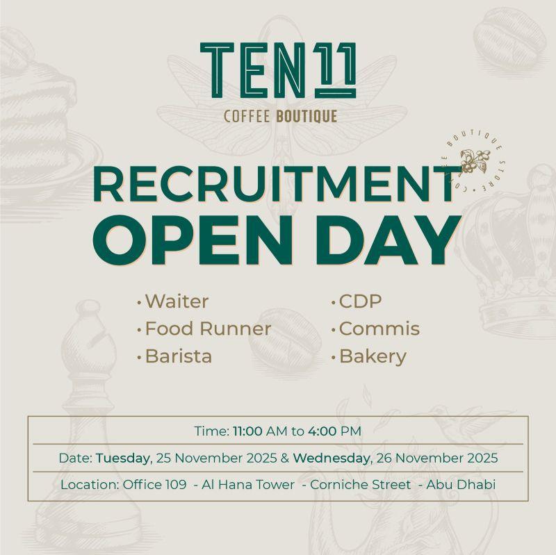 For job seekers, TEN 11 Coffee Boutique Open Day Recruitment in Abu Dhabi represents a promising platform to secure employment with a reputable café brand. Bringing an updated CV, relevant experience, and a professional attitude could significantly increase their chances. Overall, the recruitment initiative reflects a positive step in supporting employment and talent development within the local hospitality industry.