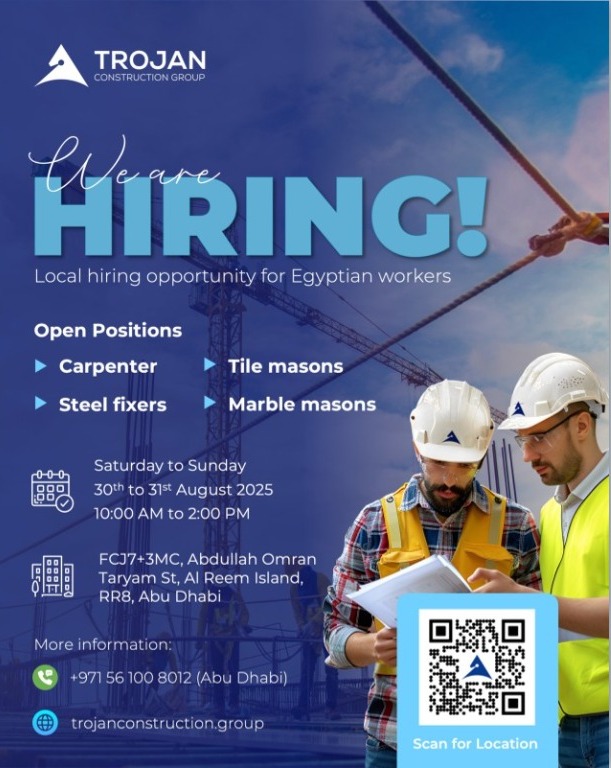 Trojan Construction Group, one of the UAE’s leading names in the construction sector, has announced a Trojan Construction Walk in Interview in Abu Dhabi specifically for Egyptian workers. The recruitment drive reflects the company’s ongoing commitment to providing skilled professionals with promising career prospects within the construction industry 📢.