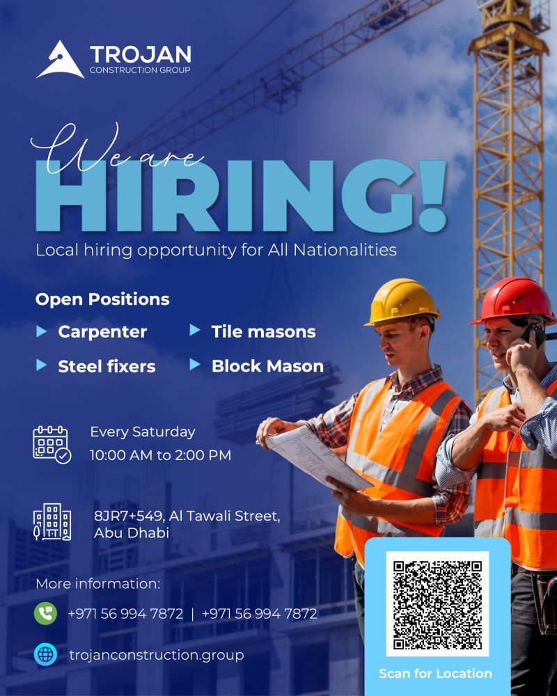 Trojan Construction Group, one of the UAEโs leading names in the construction sector, has announced a Trojan Construction Walk in Interview in Abu Dhabi. The recruitment drive reflects the companyโs ongoing commitment to providing skilled professionals with promising career prospects within the construction industry ๐ข.