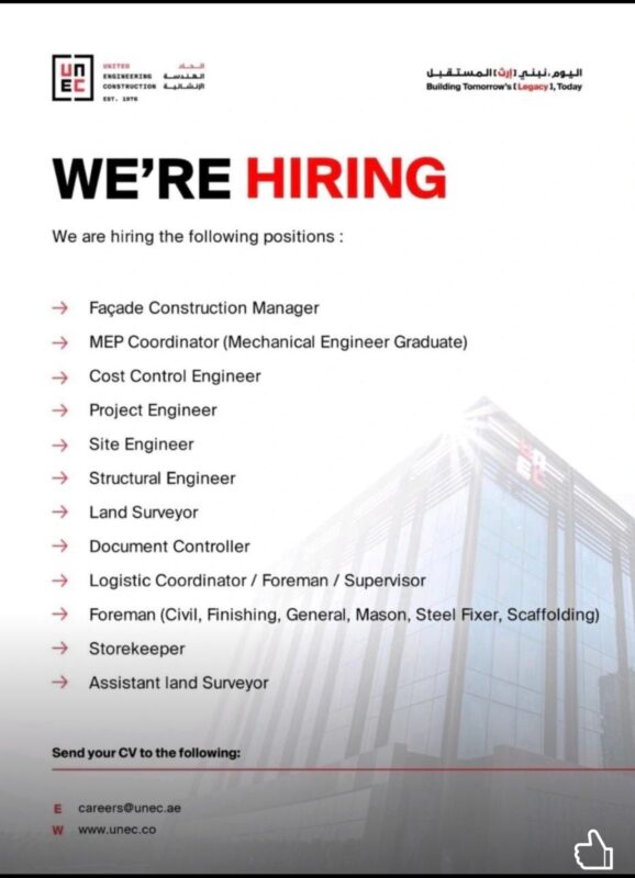 These positions reflect UNECโs ongoing demand for both technical specialists and experienced field personnel to support large, fast-paced construction projects across Dubai.